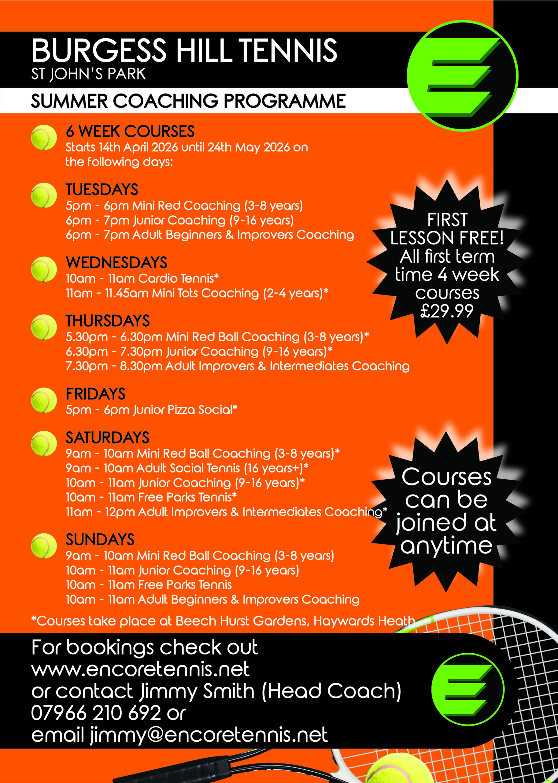 Welcome to our website where you can book, buy and browse tennis courses in Sussex. Click on the boxes to book lessons at your club. Use the menu to see what we do at Encore Tennis.